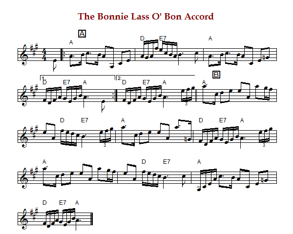 "The Bonnie Lass o' Bon-Accord" is a Scottish air or march in 4/4 time and A Major. The parts are