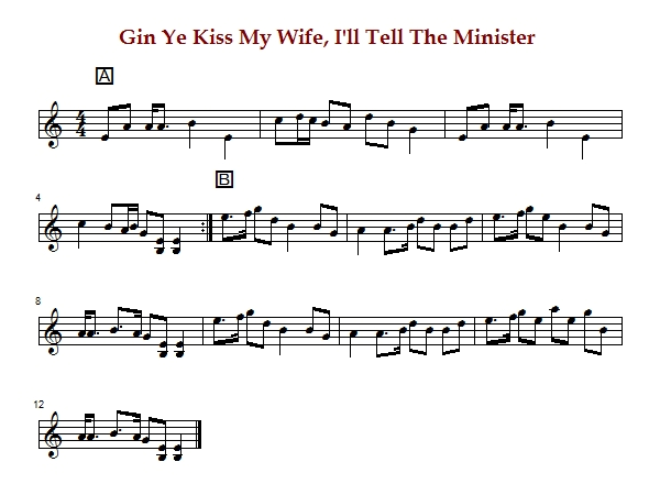 "Gin Ye Kiss My Wife I'll Tell the Minister" is a Scottish pastoral air in 4/4 time in the
