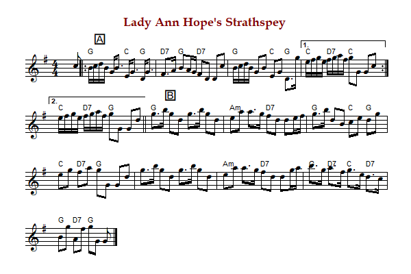 "Lady Ann Hope" is a Scottish strathspey in G Major. The parts are played AAB.