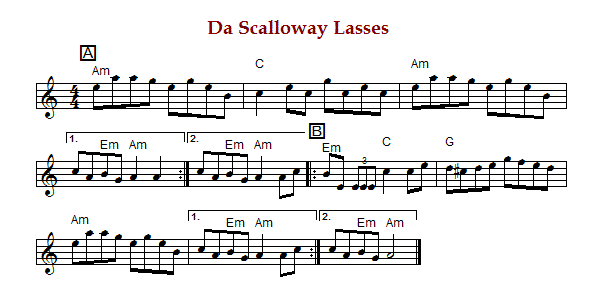 "Da Scalloway Lasses", also known as "Fair Field House" is a Shetland reel in cut time