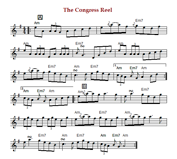 "The Congress Reel", in Gaelic "An Chomhdháil" is an Irish reel in A Aeolian (Brody) or