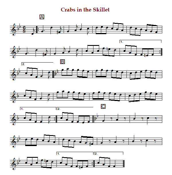 "Crabs in the Skillet", in Gaelic "Portanide/Portáin Annsa Sgileid" is an Irish double jig or