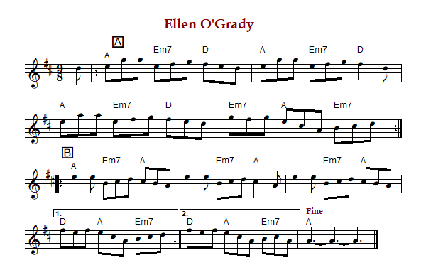 "Ellen O'Grady", in Gaelic "Eiblin NĂ Grada" is an Irish slip jig 9/8 time in