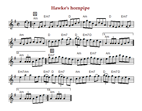 also known as "Hawk's Hornpipe" is an Irish hornpipe in A Dorian. The parts are played AABB