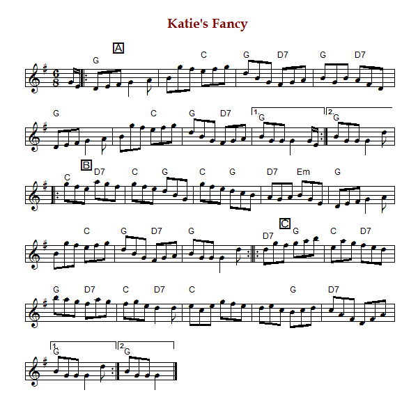 Irish double jig in 6/8 time and G Major. The parts are played AABBCC.