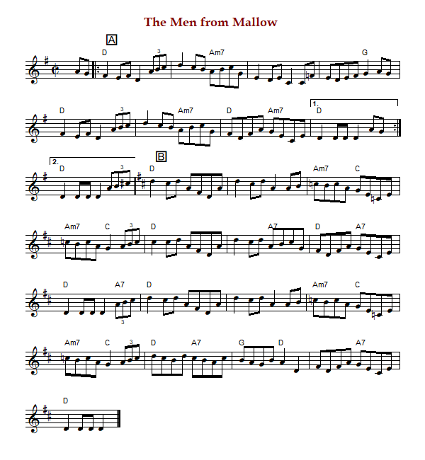 "The Men from Mallow", is an Irish hornpipe in D Major. The parts are played AAB.