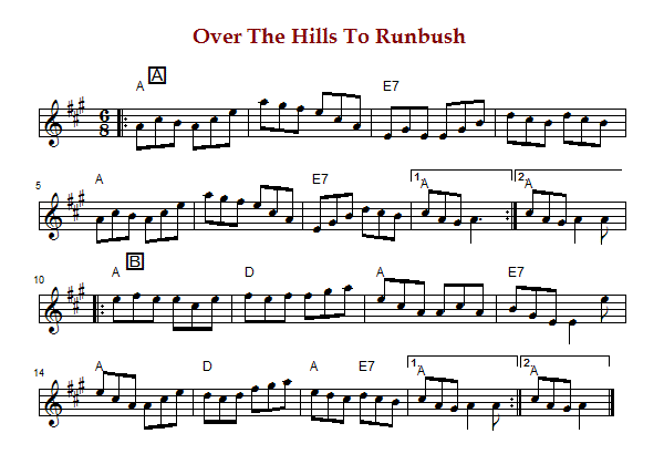 "Over The Hills To Runbush" is an Irish jig in A major.