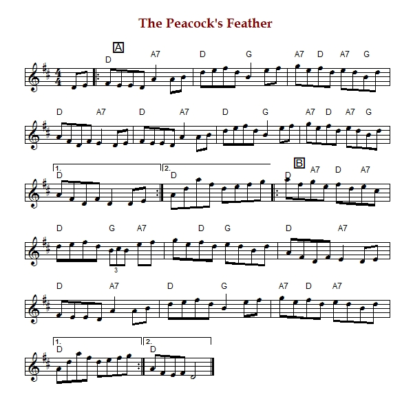 "The Peacock's Feather", in Gaelic "Cleite na Péacóige" is an Irish hornpipe in D Major.
