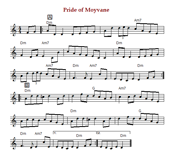"The Pride of Moyvane" is an Irish reel in D Dorian. The parts are played AABB (Black)