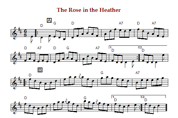 "The Rose among the Heather" is an Irish double jig in 6/8 time and D Major. The parts are played