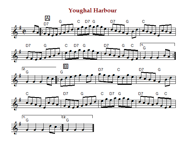 "Youghal Harbour", in Gaelic "Calad n-Eocaill", is an Irish hornpipe in E Minor or G Major