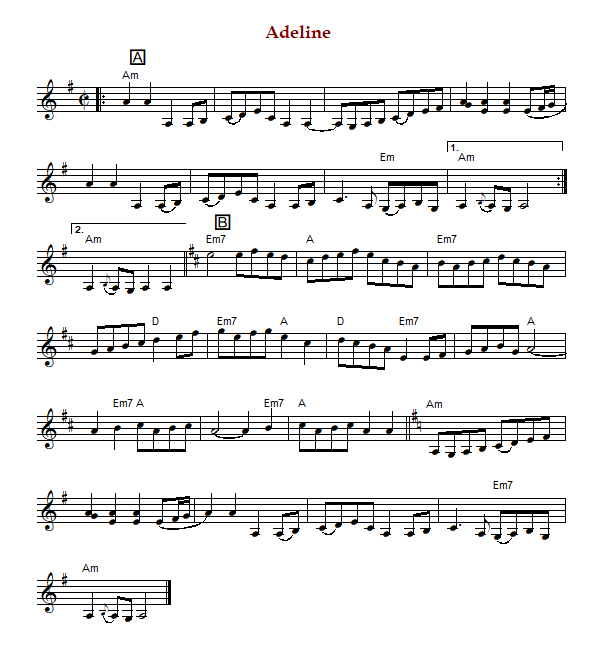 "Adeline" is an American reel in cut time and A Dorian/Mixolydian.