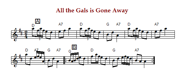 "All the Gals is Gone Away" is a reel in D. The parts are played ABB.