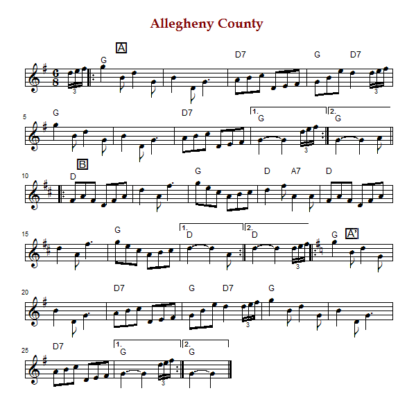 "Allegheny County" is an American jig or quadrille in 6/8 time and G Major ('A' part) & D Major