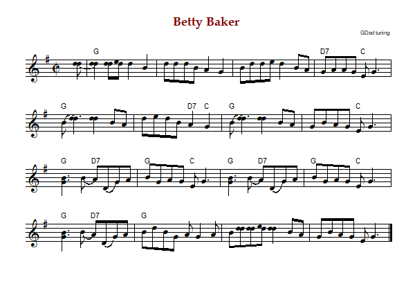 "Betty Baker" is an American reel in cut time and G Major. It is played in GDad fiddle tuning.