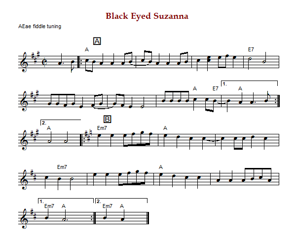 "Black Eyed Suzanna" is an American reel in cut time, A Major and A Mixolydian.