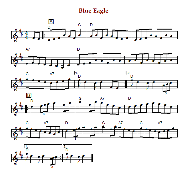 "Blue Eagle" is an Old-Time breakdown from Texas in D Major. The parts are played