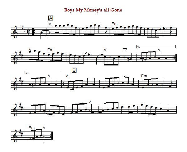 "Boys My Money's all Gone" is an American reel in cut time and A Dorian or Mixolydian/Dorian.