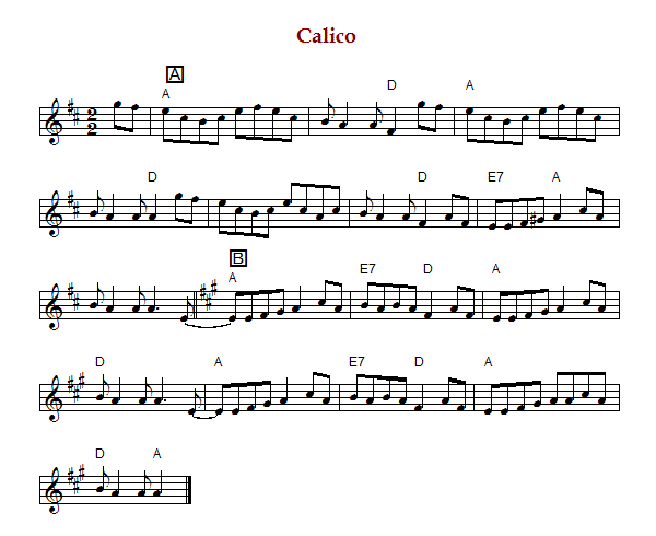 "Calico", also known "Want to go to Meeting and Got No Shoes" is an American reel in cut time
