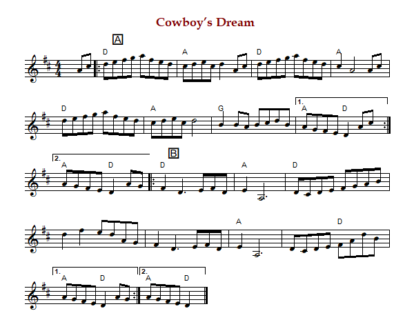 "Cowboy’s Dream" is an American reel in cut time and D Major. The parts are played AB