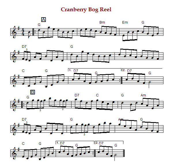 "The Cranberry Bog" is an American Reel in G Major. The parts are played AA’BB’.