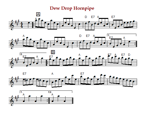 "Dew Drop Hornpipe" is an American hornpipe in A Major. The parts are played AABB.