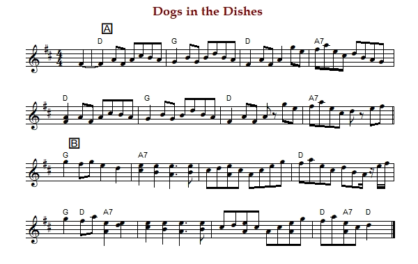 "Dogs in the Dishes" is an old time reel or breakdown in D Major. The parts