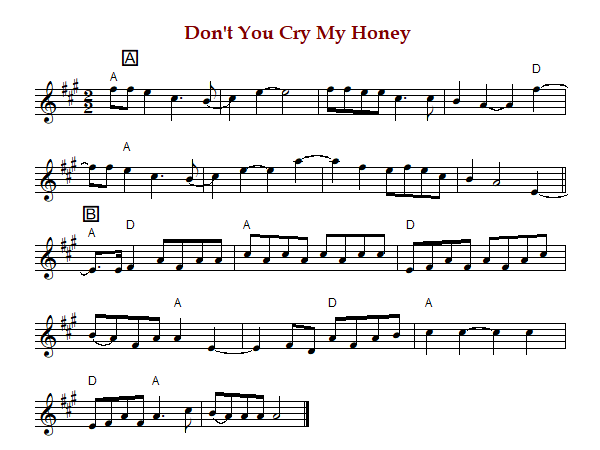 "Don't You Cry My Honey" is an American song/reel in cut time and A Major.