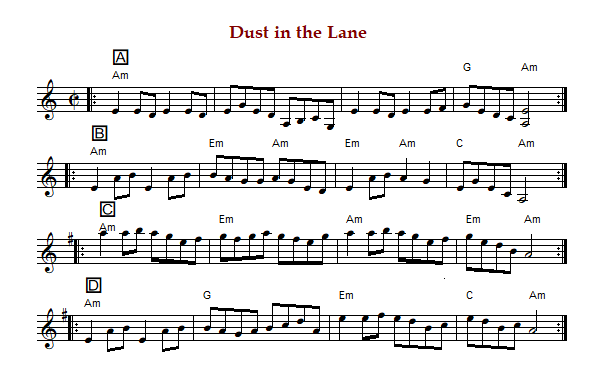 American breakdown in A minor and A Dorian. The parts are played AABBCCD.