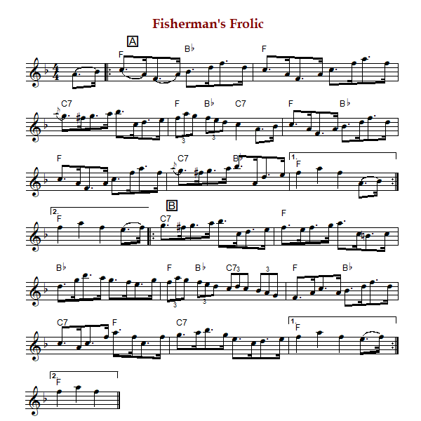 "Fisherman's Frolic" is an American clog in F Major. The parts are played AABB.
