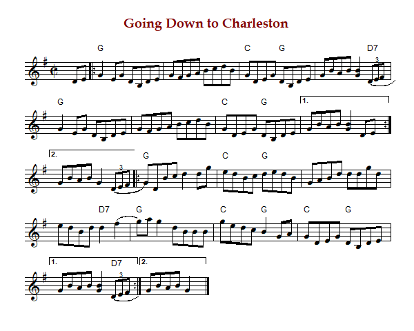 "Going Down to Charleston" is an American reel in 2/4 or cut time and G Major.