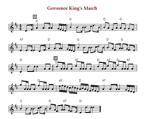 "Governor King's March" is an American march in 4/4 time and D major. The parts are