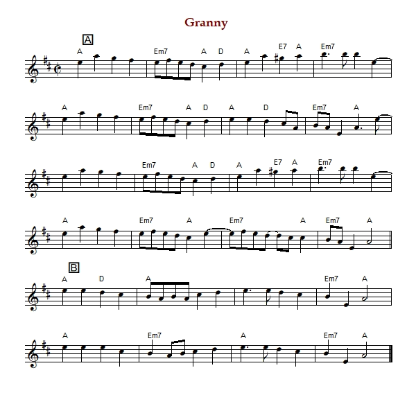 "Granny" is an American reel in cut or 4/4 time and A Mixolydian. The parts are played AB.