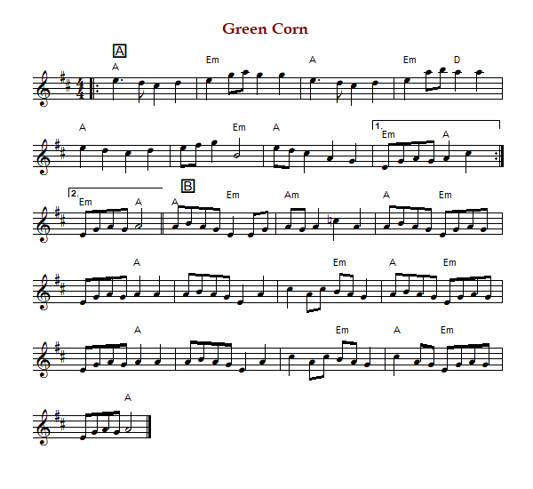 "Green Corn", also known as "Hot Corn, Cold Corn" is an old-time breakdown in A Mixolydian.