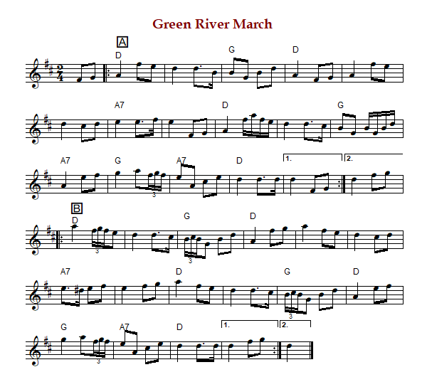 "Green River March" is an American reel in D Major. The parts are played AABB.