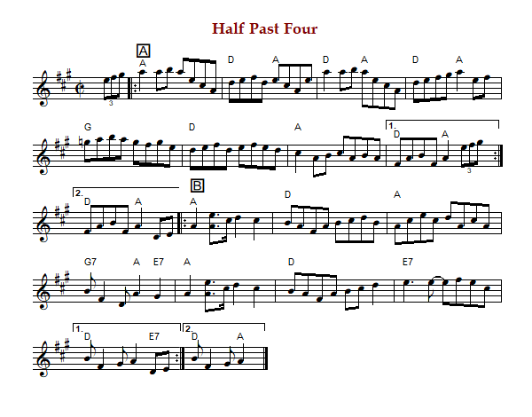 American reel in whole or cut time and A Major. AEae tuning (fiddle).