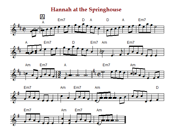 "Hannah at the Springhouse" is an American reel in cut time and A Mixolydian ('A' part) &