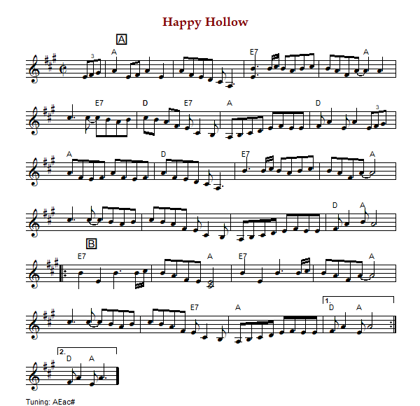 "Happy Hollow", also known as "Happy Holler" is an American reel in cut time and A Major.