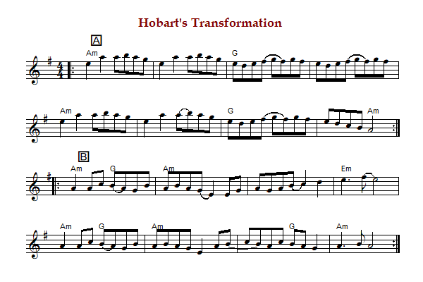 "Hobart's Transformation" is an American old-time breakdown in A Dorian. The parts are