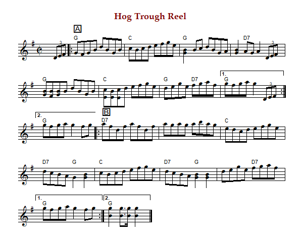American reel in cut time and G Major. The parts are played AABB'. "Hog Trough
