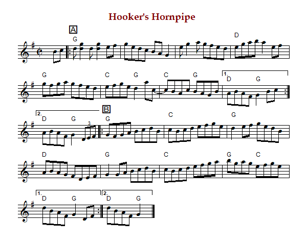 "Hooker's Hornpipe" is an American hornpipe in 2/4 time and G Major. The parts are played
