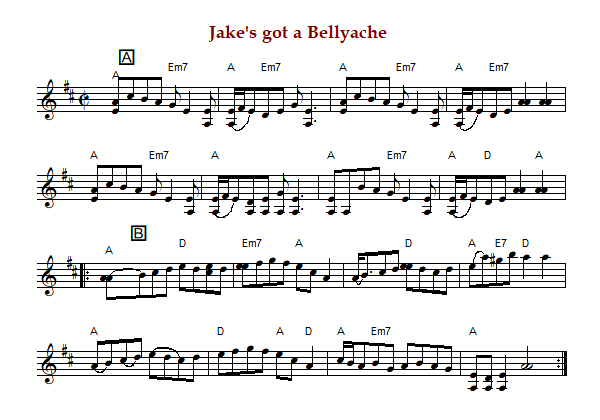 "Jake's got a Bellyache", is an American reel in cut time and A Mixolydian.