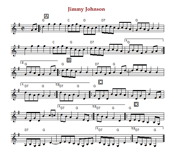 "Jimmy Johnson" is an American reel in cut time and G Major or A Major with AEae fiddle tuning.