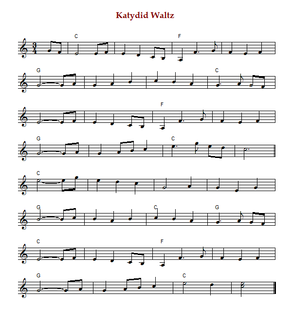 "Katydid Waltz" is an American waltz in 3/4 time and G Major.