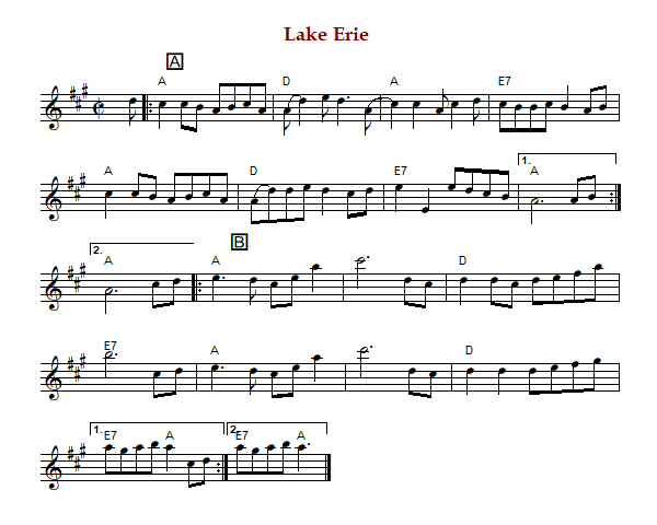"Lake Erie" is an American reel in cut time and A Major (Sharp) or D Major (Songer).