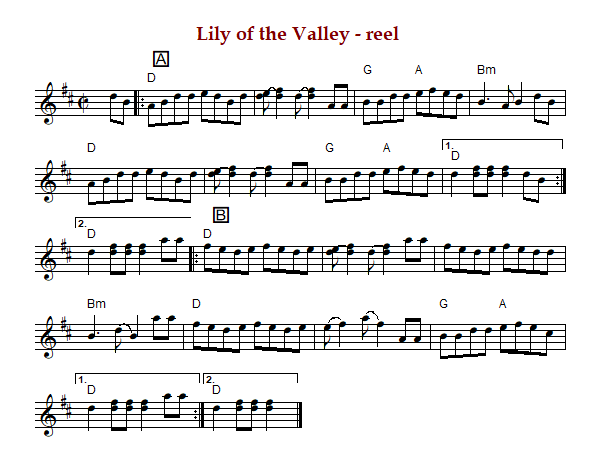 "Lily of the Valley" is an American reel in D Major. The parts are played AABB.