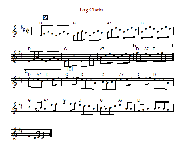 "Log Chain" is an American reel in cut time and D Major. The parts are played AB (Silberberg) or AABB (Phillips).
