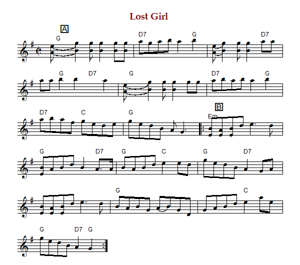 "Lost Girl" is an old-time breakdown or reel in G Major (Silberberg, Titon) or C Major