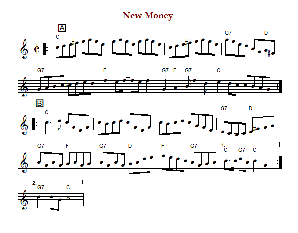 "New Money" is an American reel in cut time and C Major. The parts are played AABB.