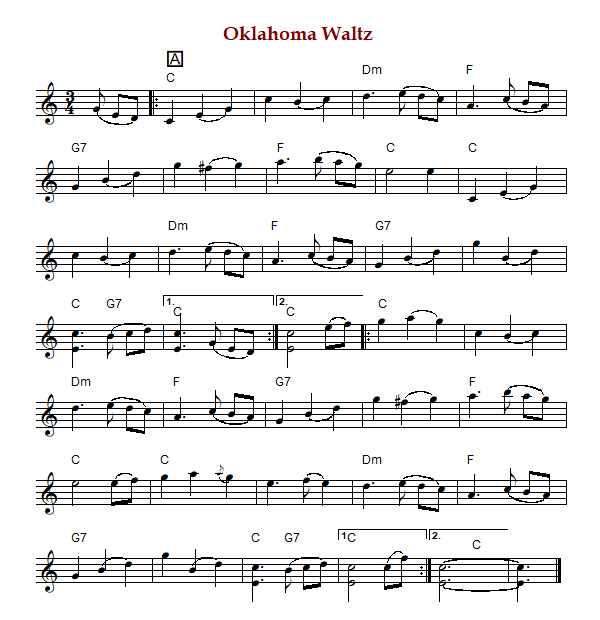 "Oklahoma Waltz" is an American waltz in C Major. The parts are played AABB (Thede) or